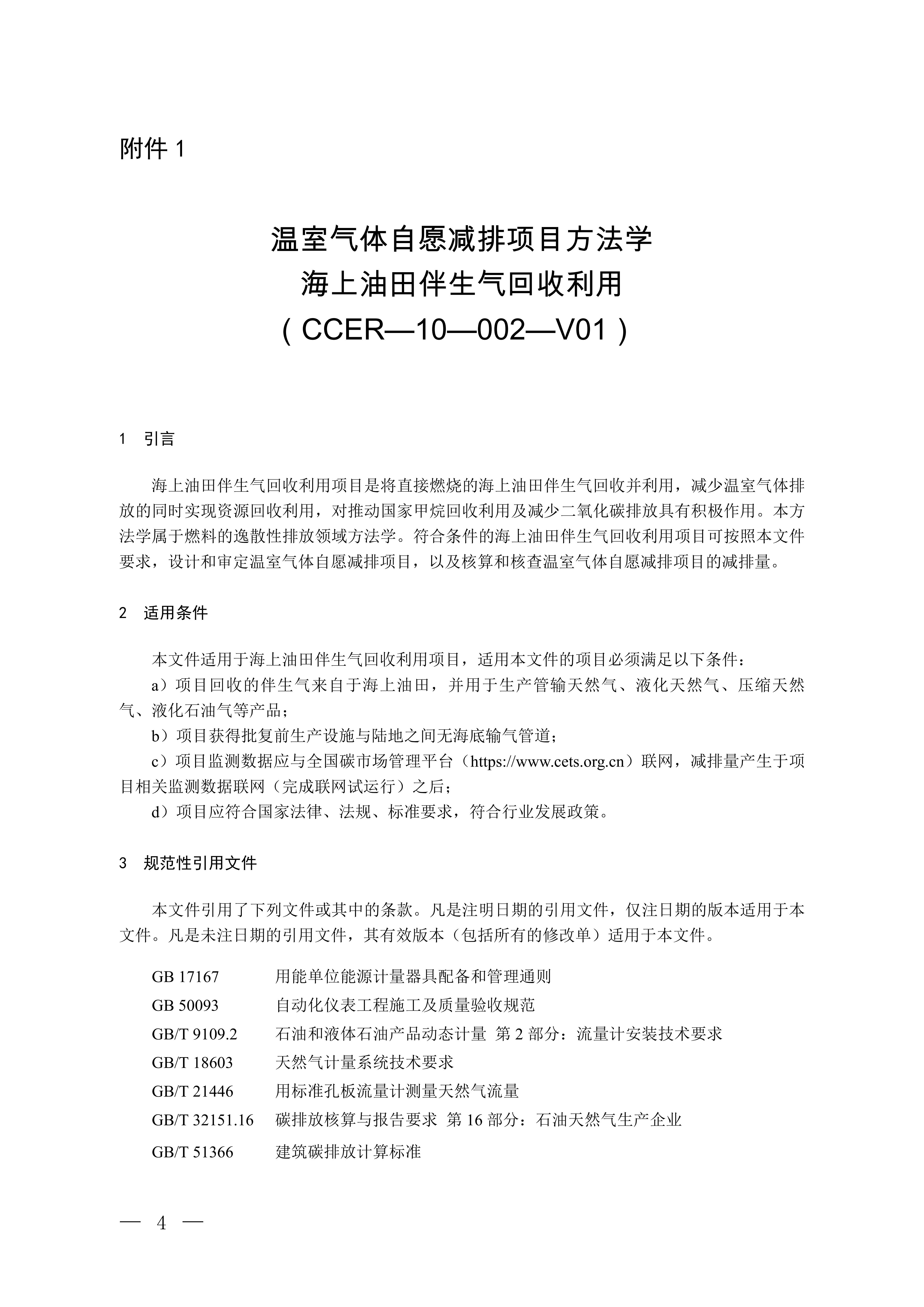 1.温室气体自愿减排项目方法学 海上油田伴生气回收利用(CCER-10-002-V01)