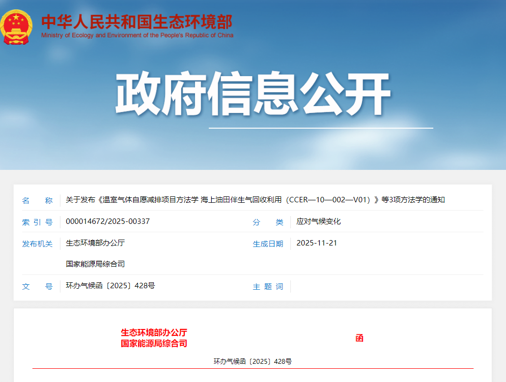 政策 | 关于发布《温室气体自愿减排项目方法学 海上油田伴生气回收利用(CCER—10—002—V01)》等3项方法学的通知